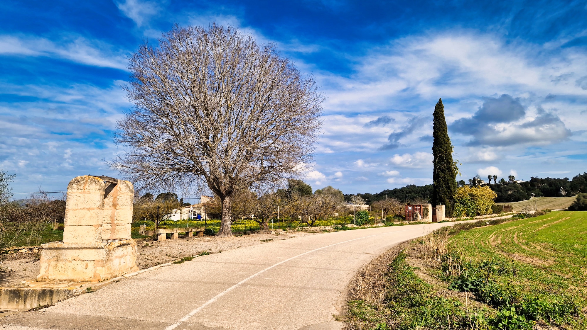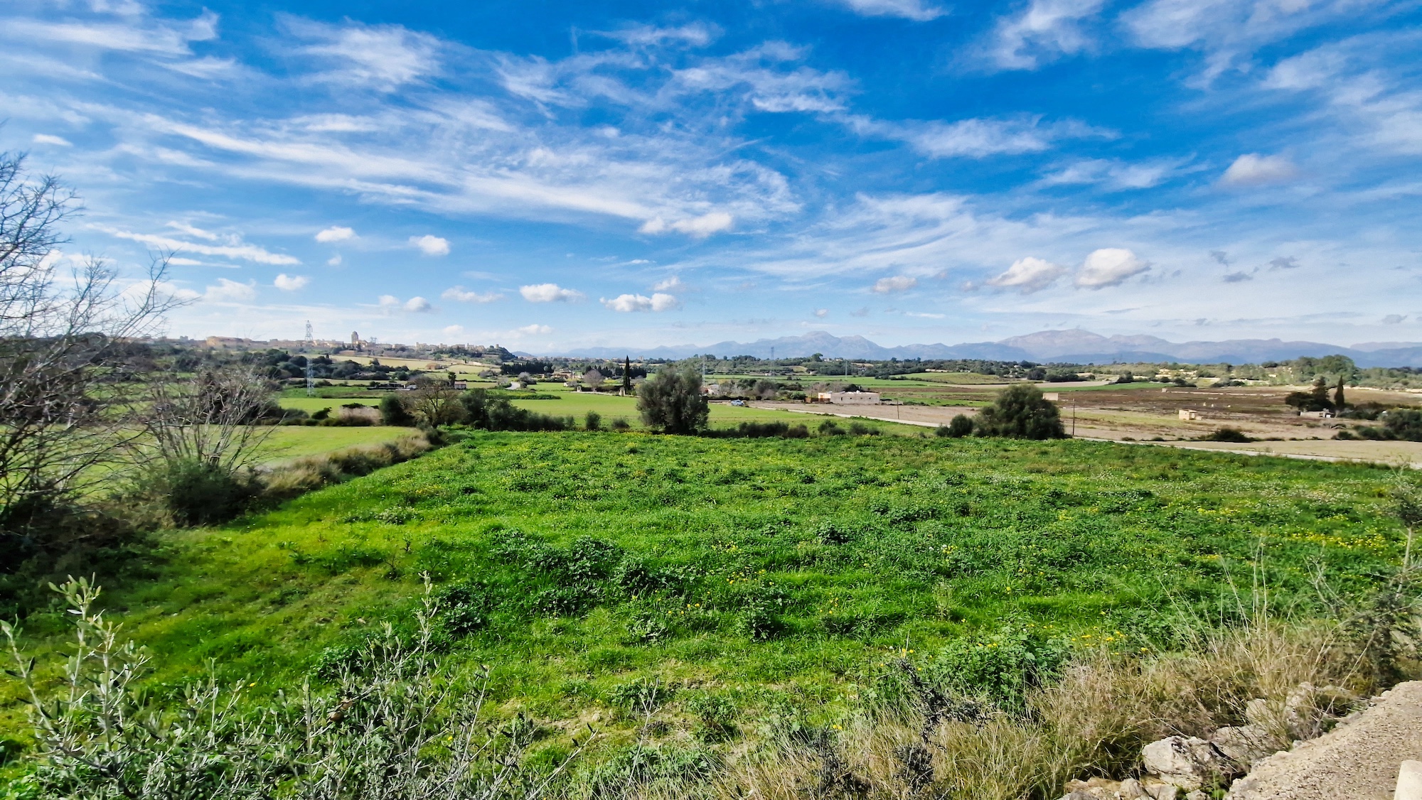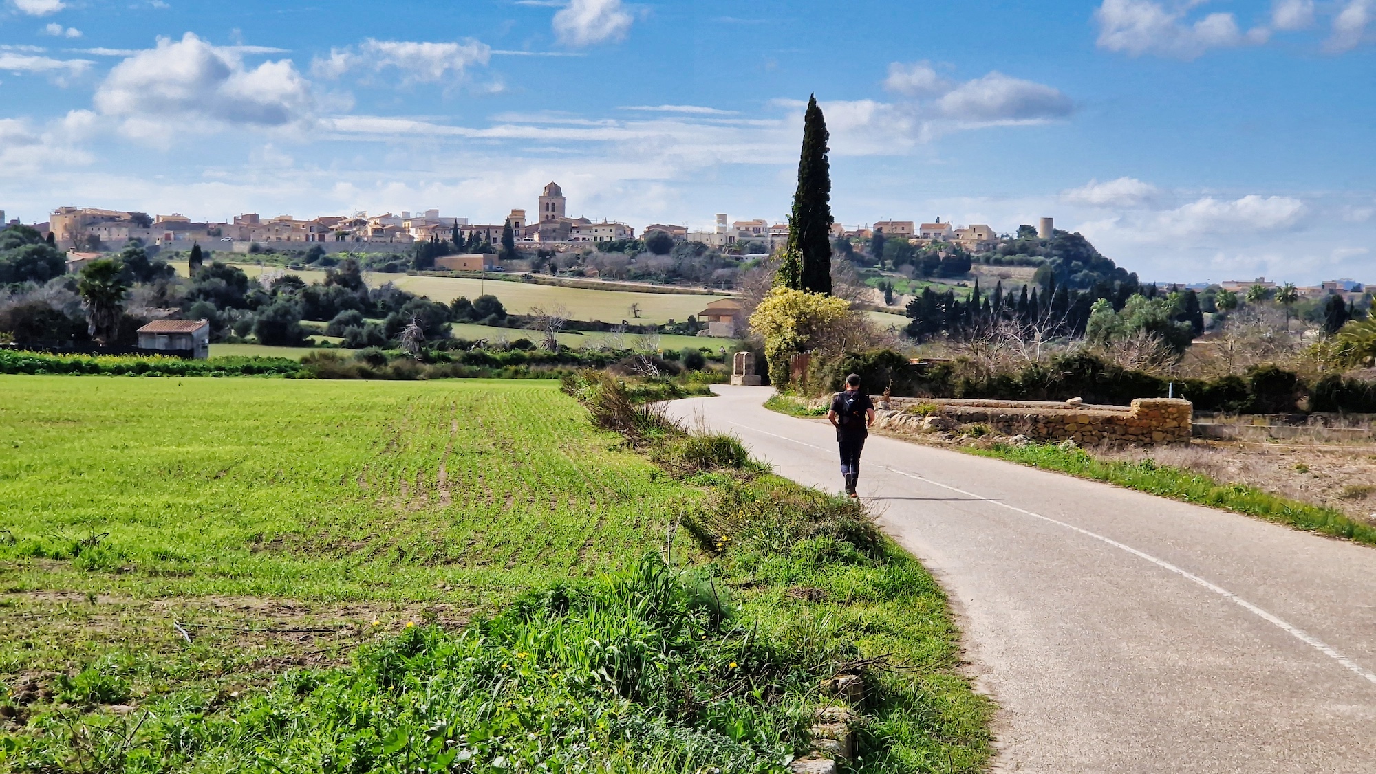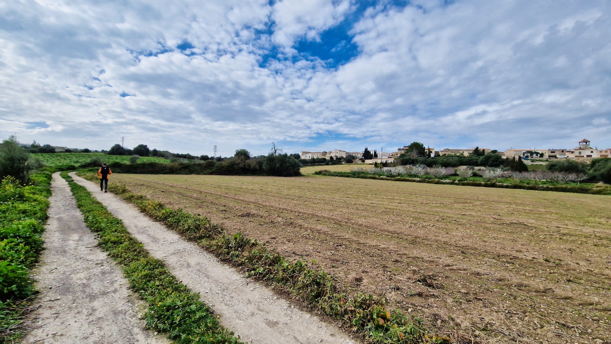 Volvemos a enganchar el carrer Major y pasamos por la Creu de l’Alba y vamos saliendo del pueblo en dirección sur. Al llegar a la siguiente cruz (Creu dels Jueus), nos desviamos por el camí vell de Santa Margalida. Como siempre los paisajes en invierno por el pla de Mallorca están teñidos de verde, una estampa preciosa.