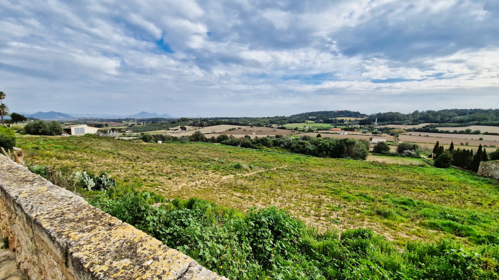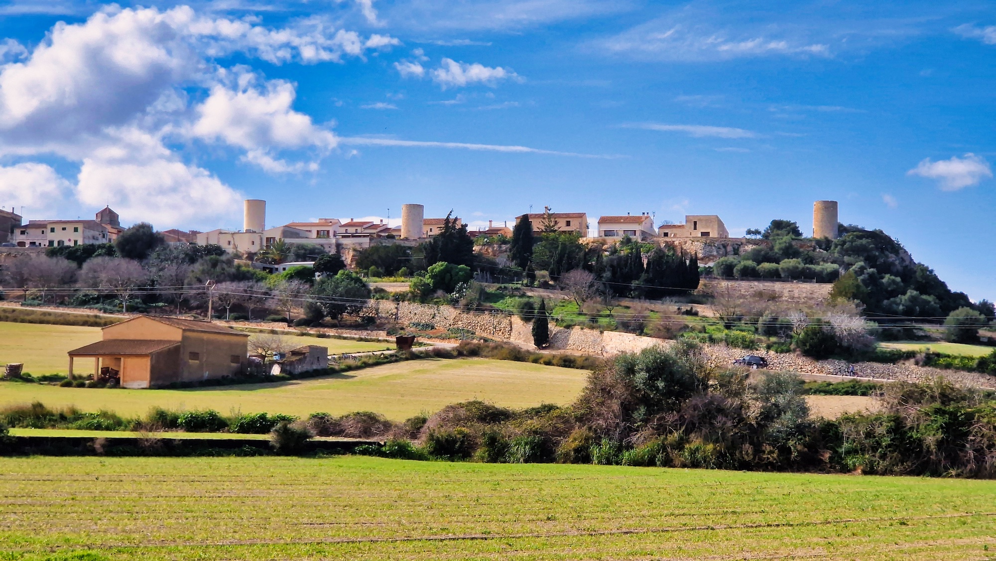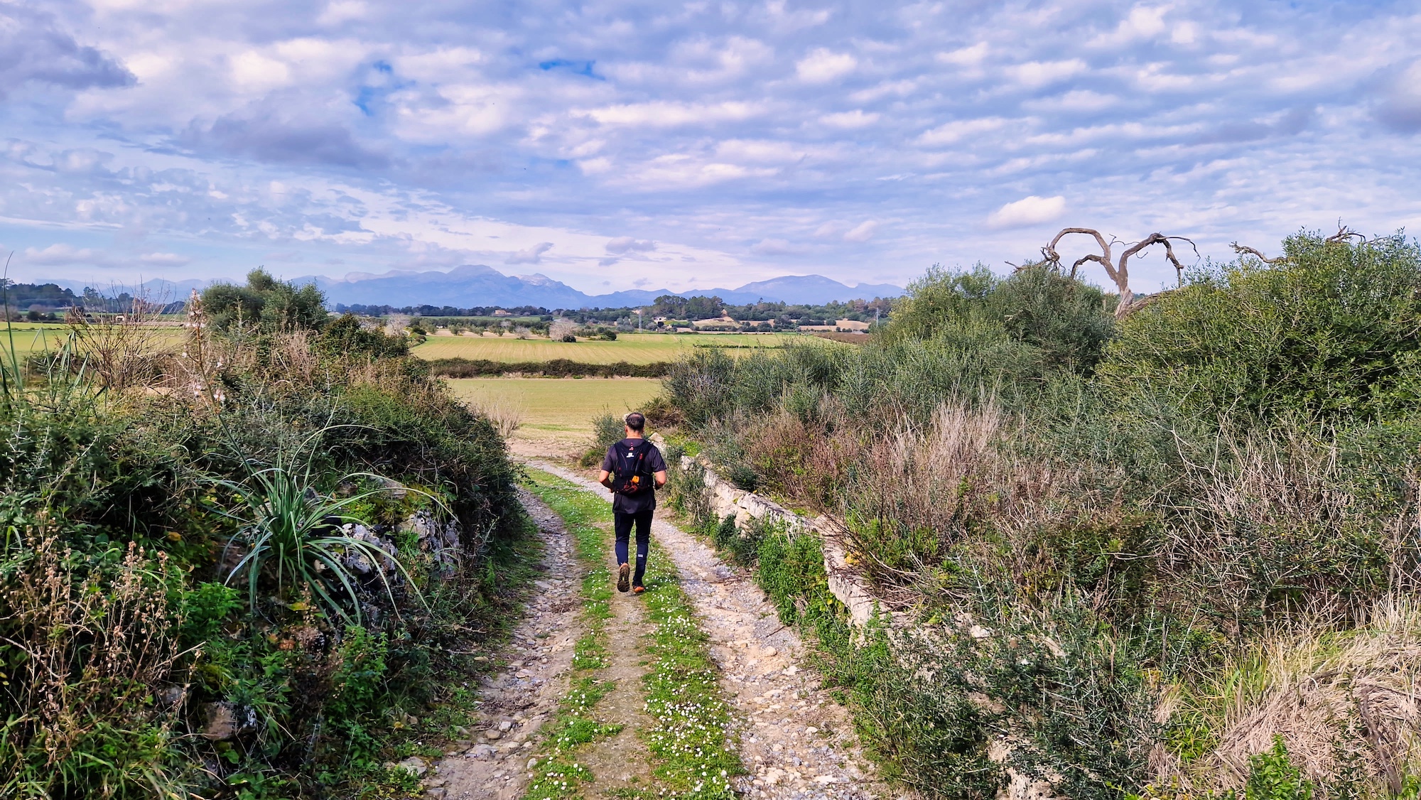 Volvemos a enganchar el carrer Major y pasamos por la Creu de l’Alba y vamos saliendo del pueblo en dirección sur. Al llegar a la siguiente cruz (Creu dels Jueus), nos desviamos por el camí vell de Santa Margalida. Como siempre los paisajes en invierno por el pla de Mallorca están teñidos de verde, una estampa preciosa.