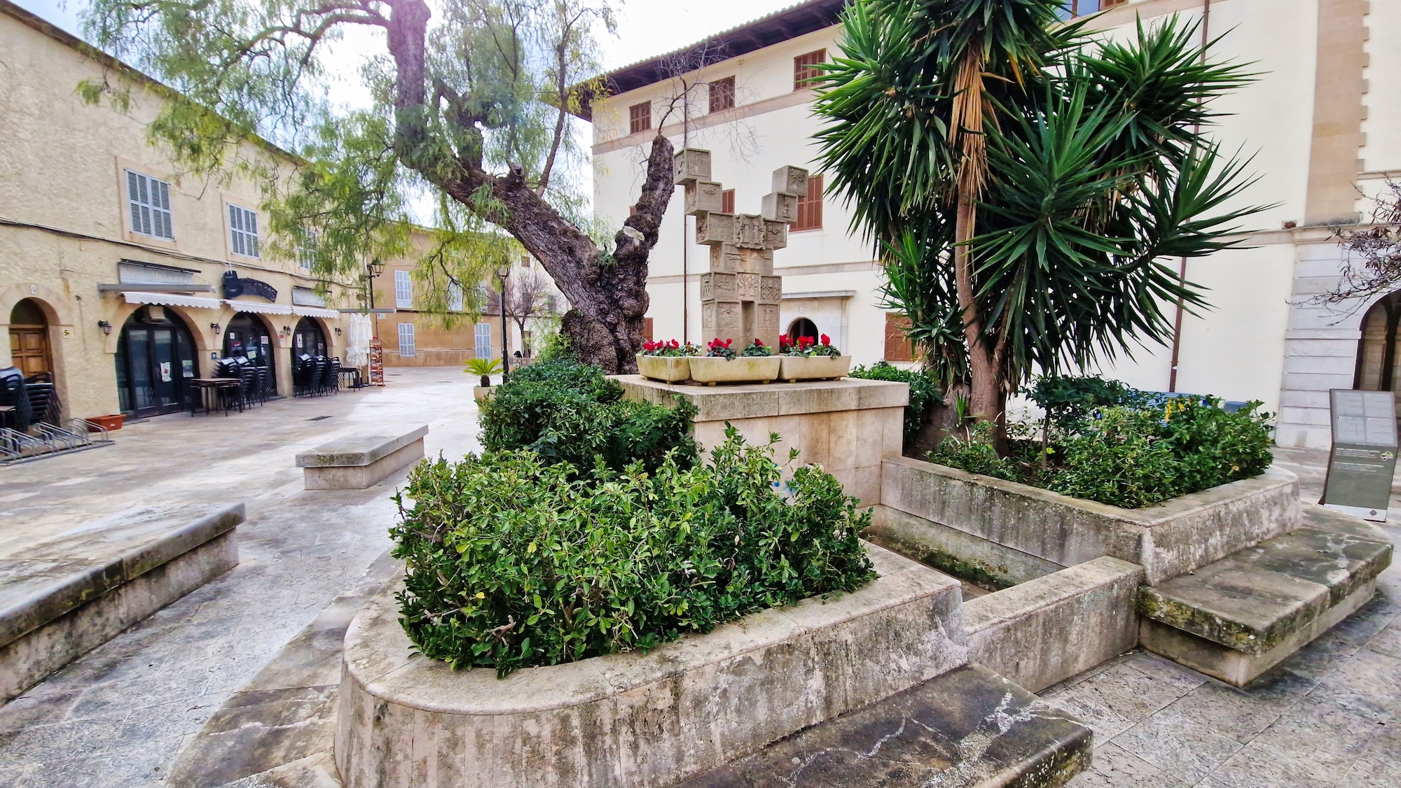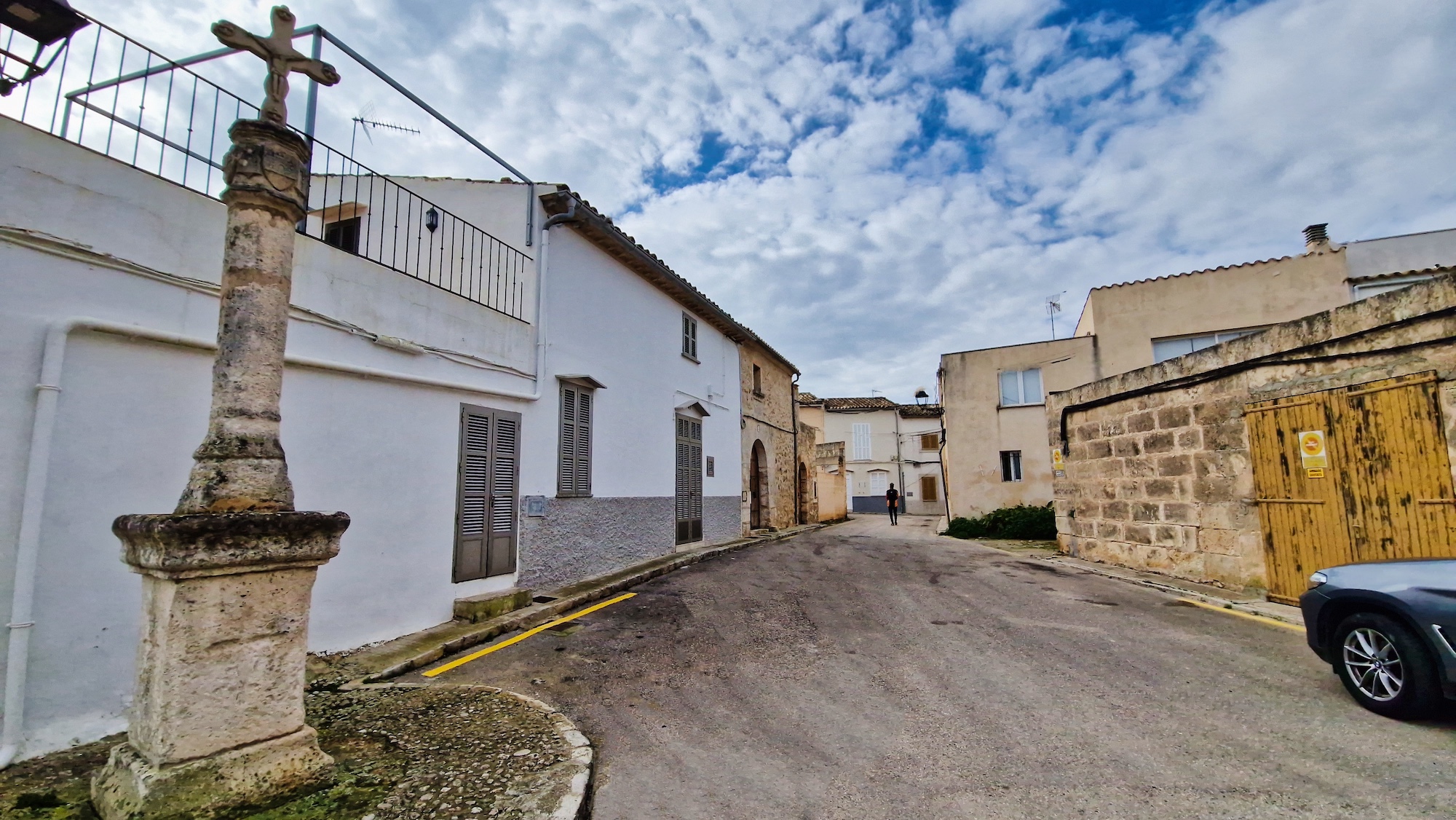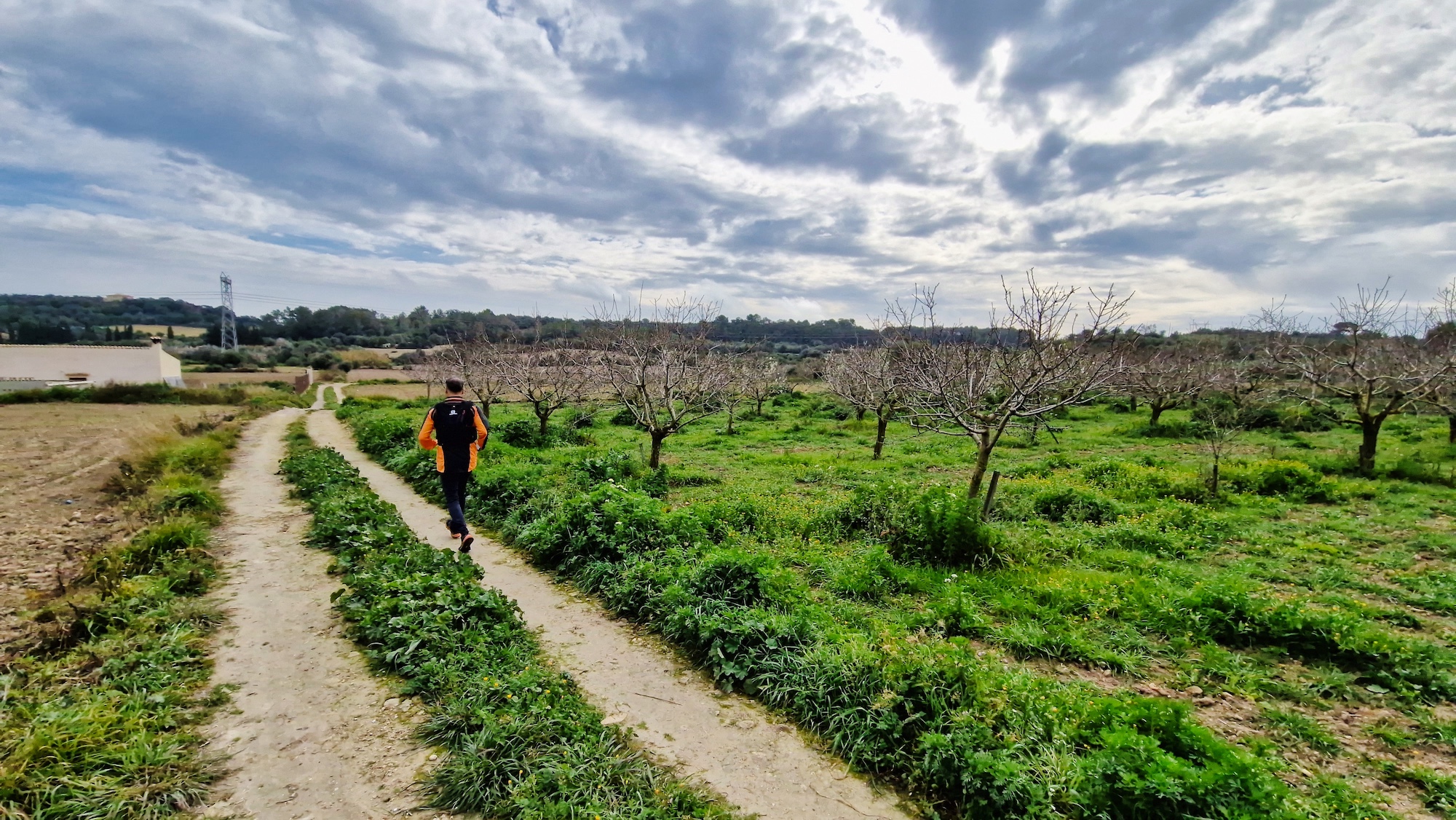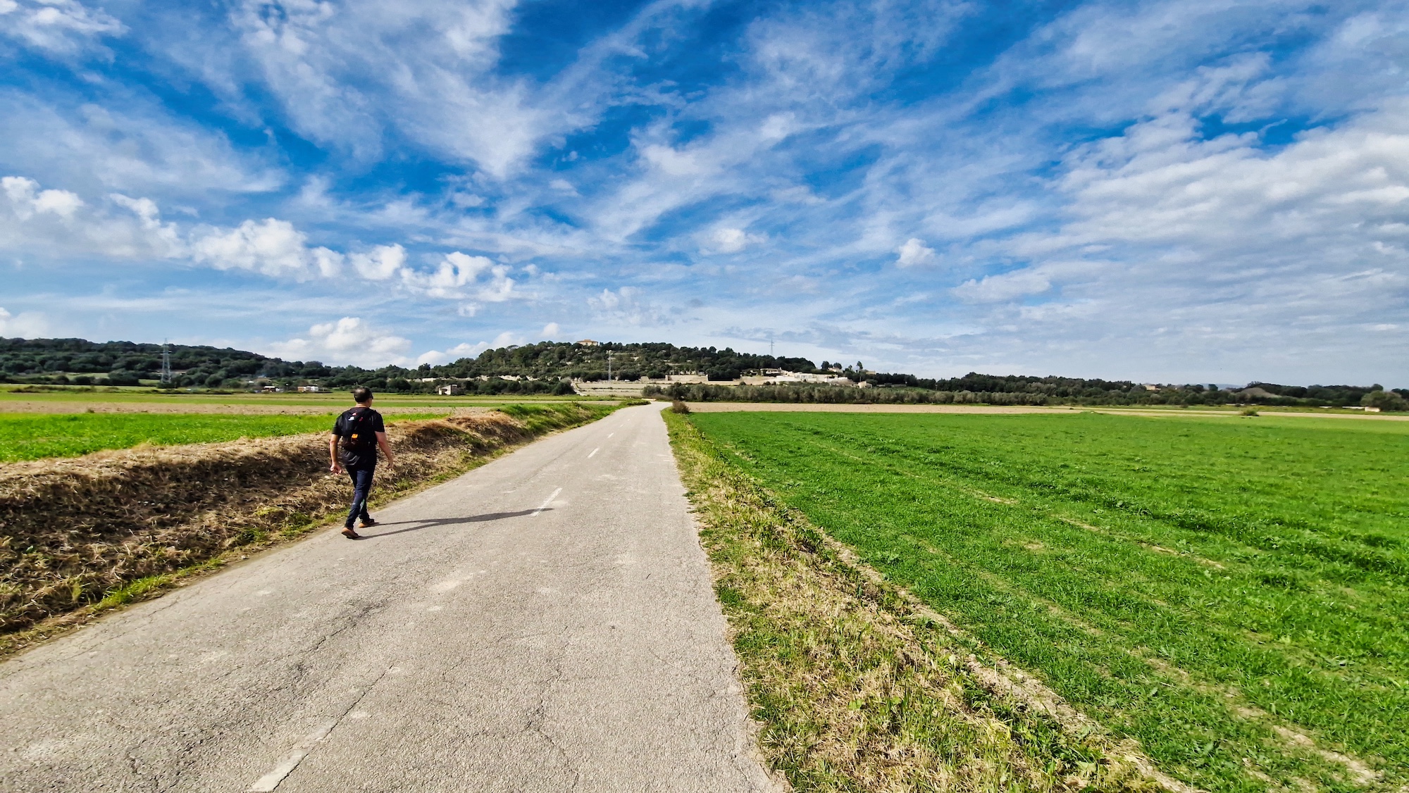 Volvemos a enganchar el carrer Major y pasamos por la Creu de l’Alba y vamos saliendo del pueblo en dirección sur. Al llegar a la siguiente cruz (Creu dels Jueus), nos desviamos por el camí vell de Santa Margalida. Como siempre los paisajes en invierno por el pla de Mallorca están teñidos de verde, una estampa preciosa.