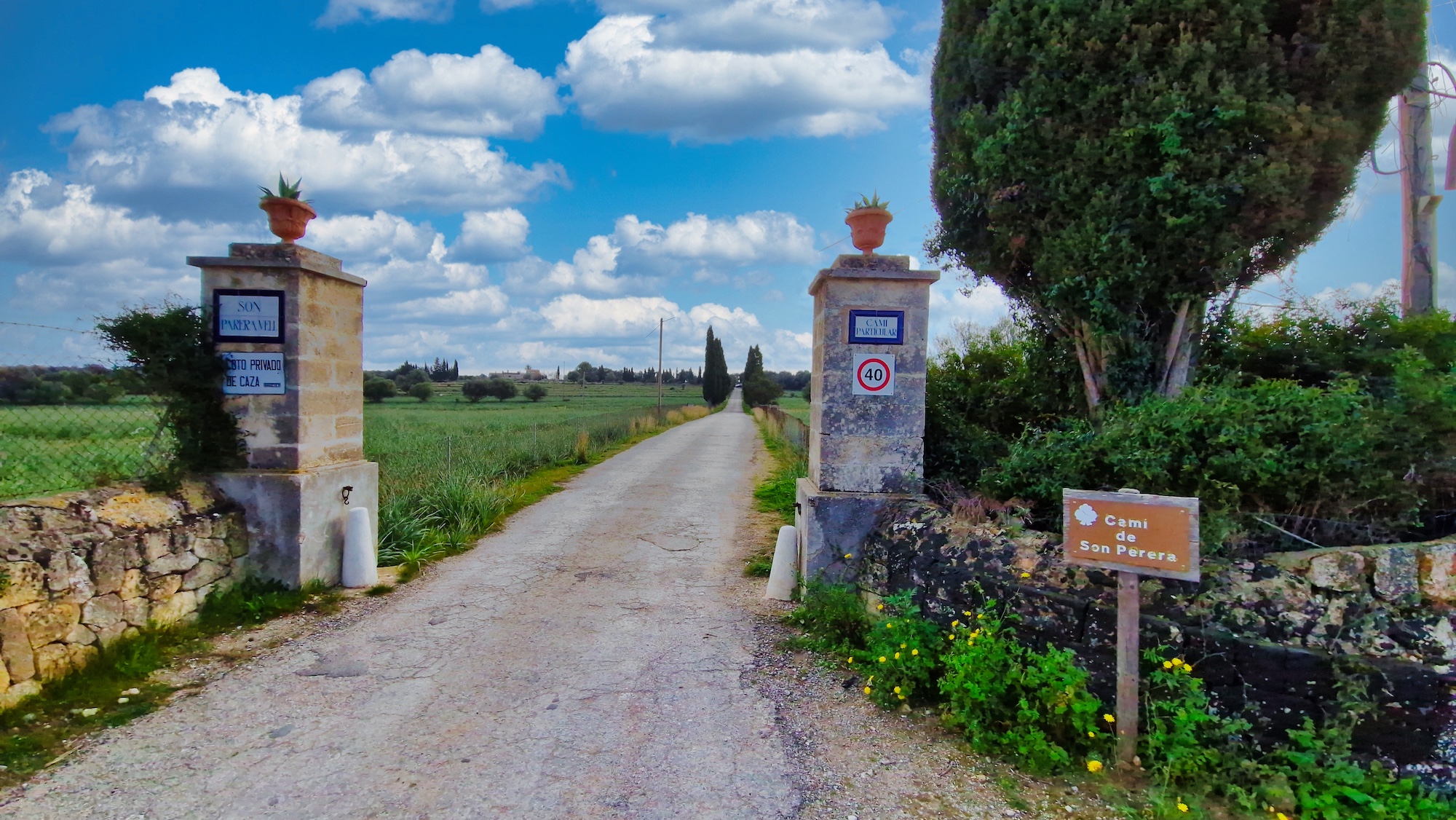 Inmumerables caminos del municipio como el camí des Prat den Joi, Camí de sa Grava, Camí des Pou Vell nos aproximan a la finca de Son Perera Vell, una finca de alquiler vacacional, podremos ver los muros de la entrada durante la ruta.