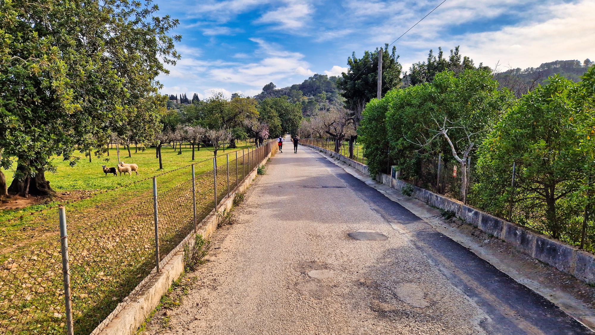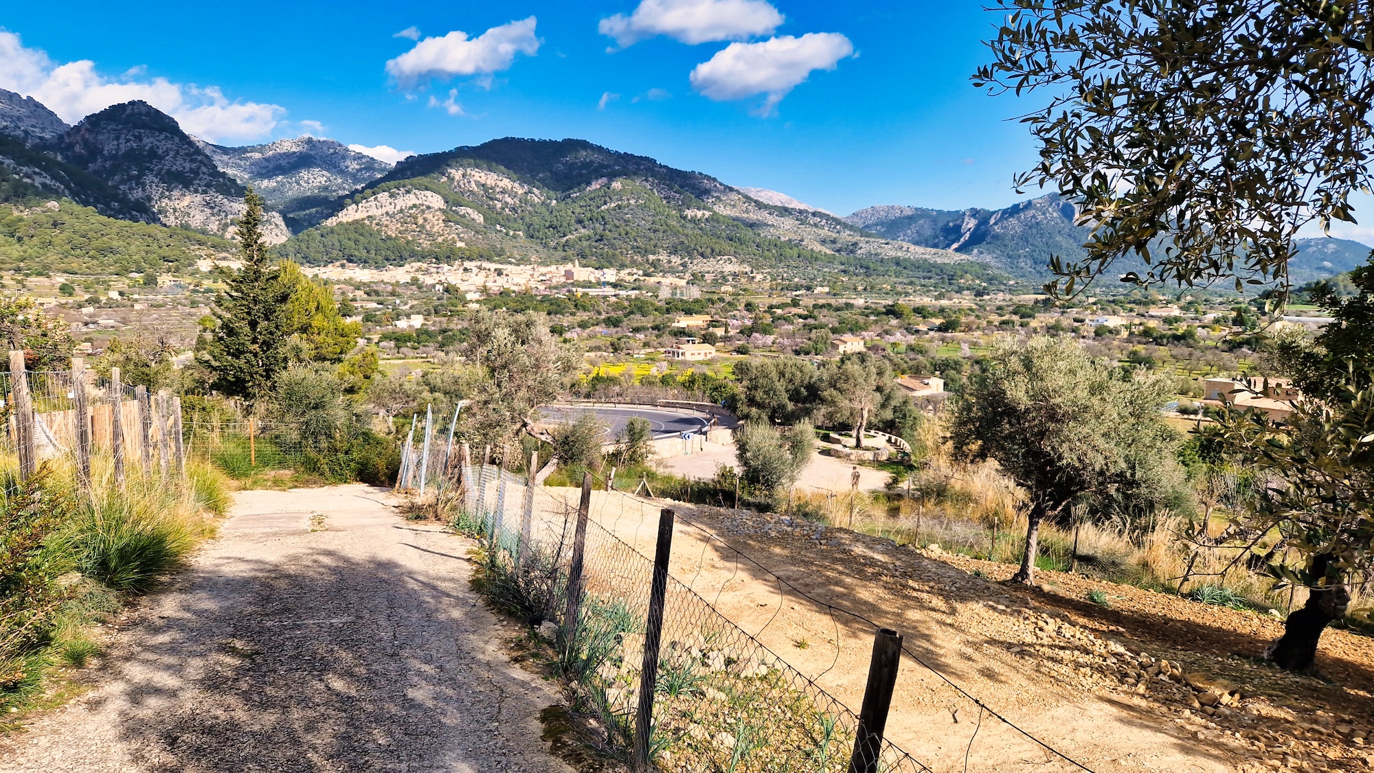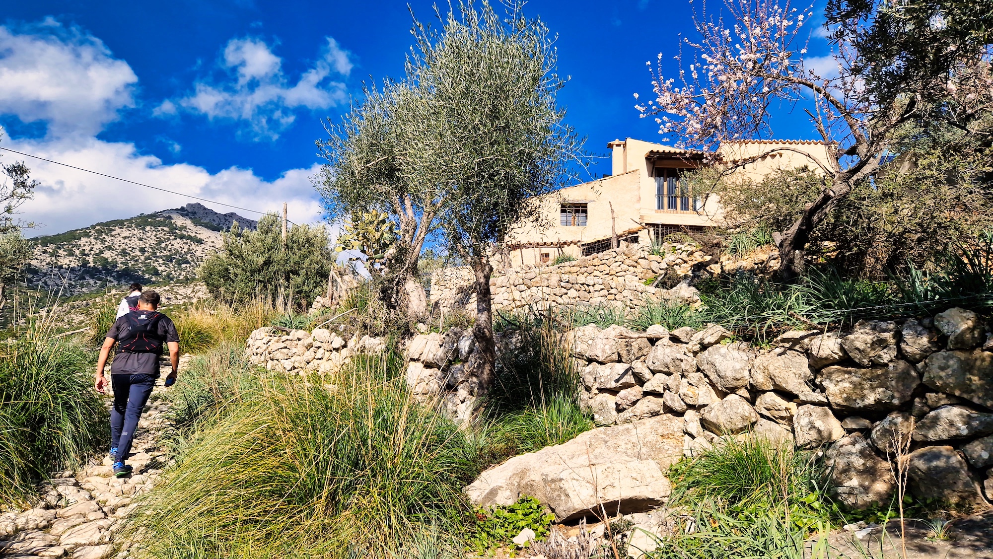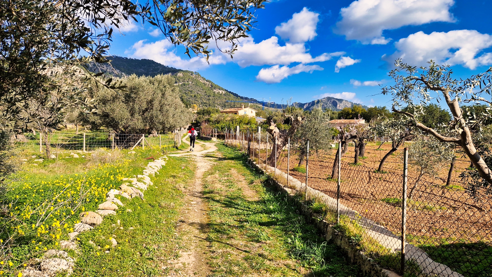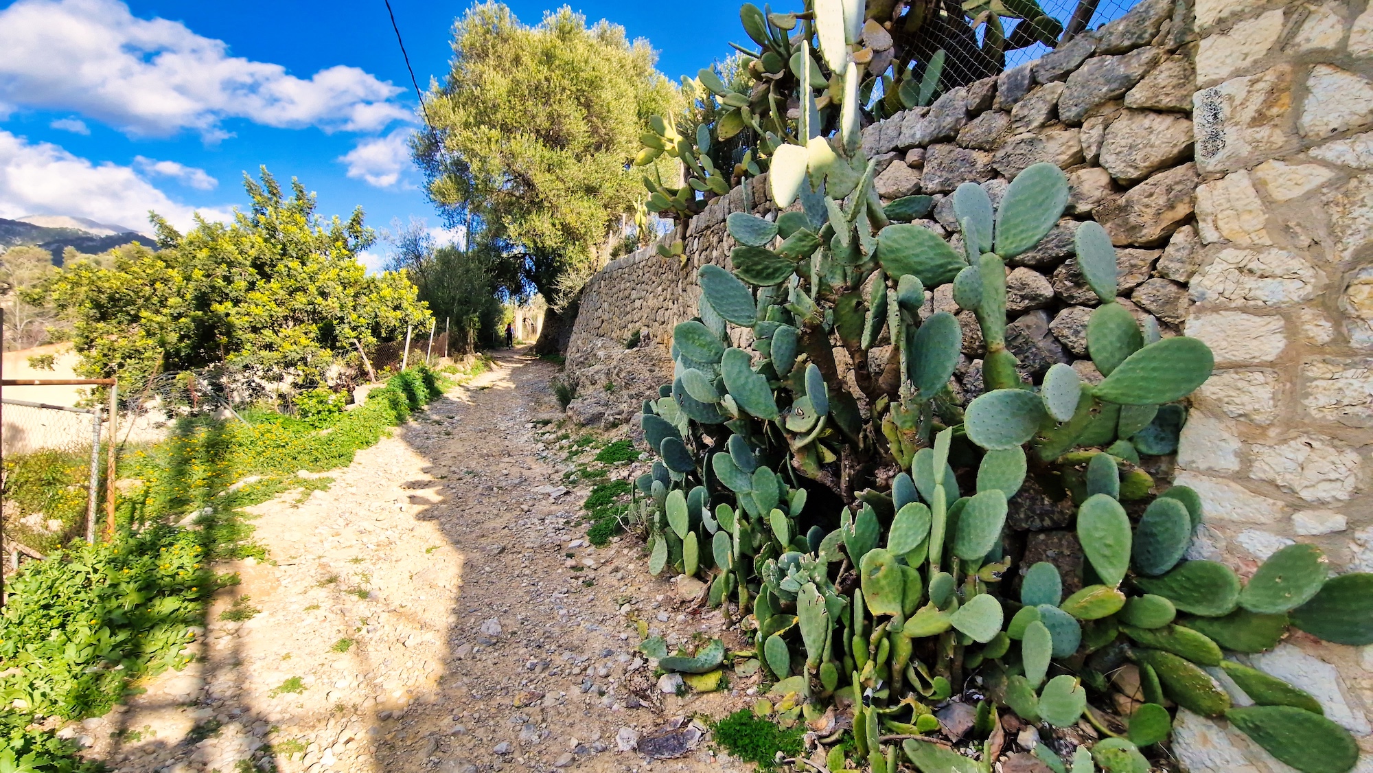 Desde el carrer de So N’Arnau arrancamos a trotar ligeramente como siempre por el camí vell de Caimari, un tramo que forma parte del GR222 con un día espléndido de finales de enero. El paisaje es casi primaveral entre casas rurales, jardines de oliveras y almendros en flor, una maravilla para los sentidos.