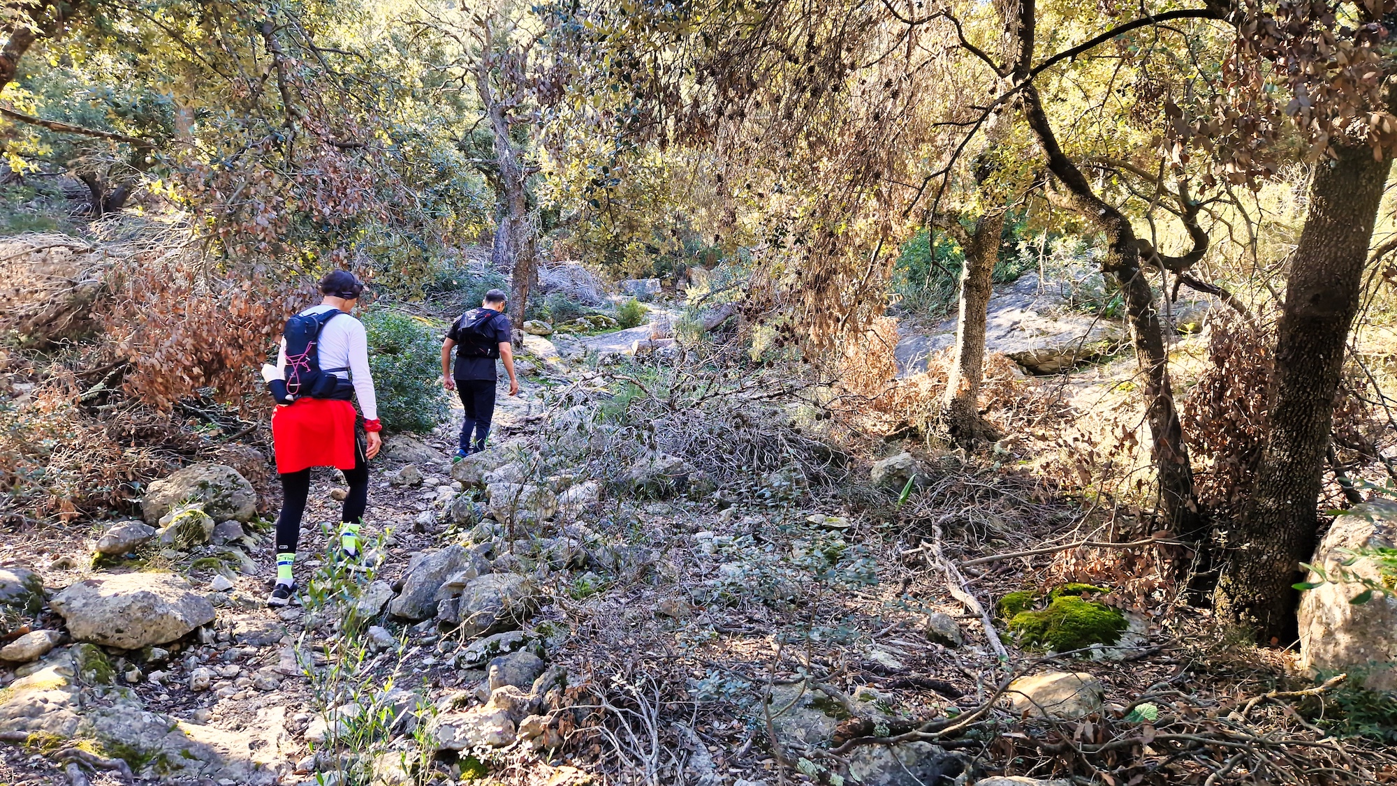 Con el aliento acelerado llegamos al Coll Matar, collado que da nombre a la zona de la comuna. Iniciamos el descenso algo técnico por un sendero que se introduce en la Coma de’n Mairata y localizamos otros elementos que dan testimonio de la explotación forestal de este espacio comunal, un hornos de cal, un abrevadero, diversos coll de tords.