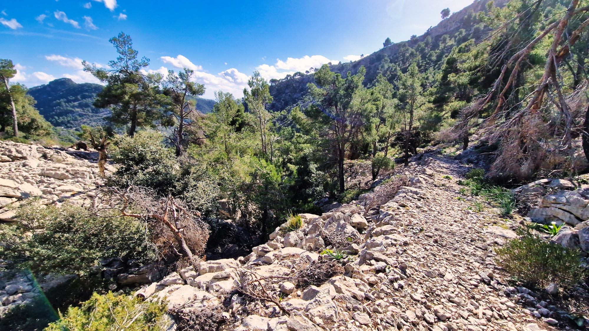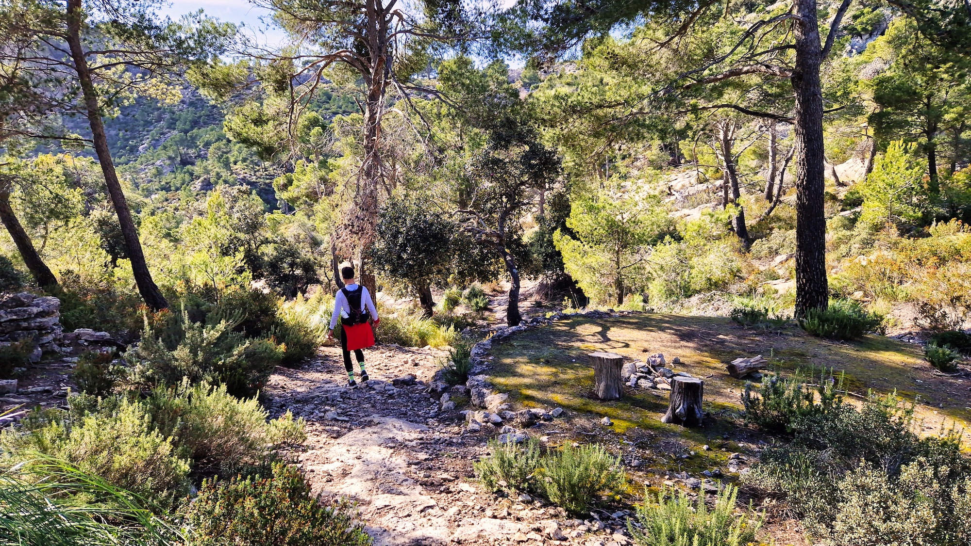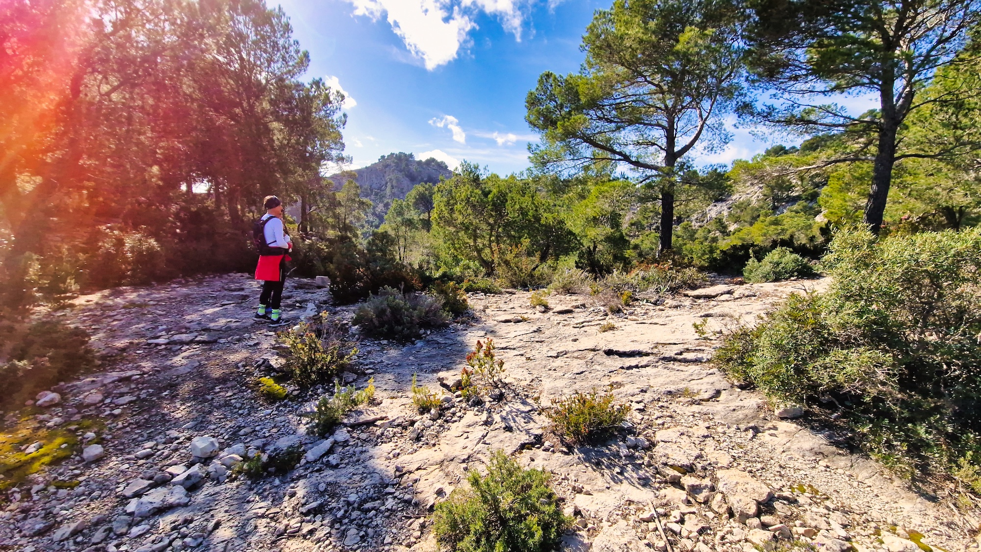 Subimos por dentro del comellar por una trialera bien definida y con pendiente bastante exigente, hasta llegar a una explanada de roca rodeada de pinos, que es el punto más alto de la ruta. Un lugar aislado y poco conocido con magníficas vistas.