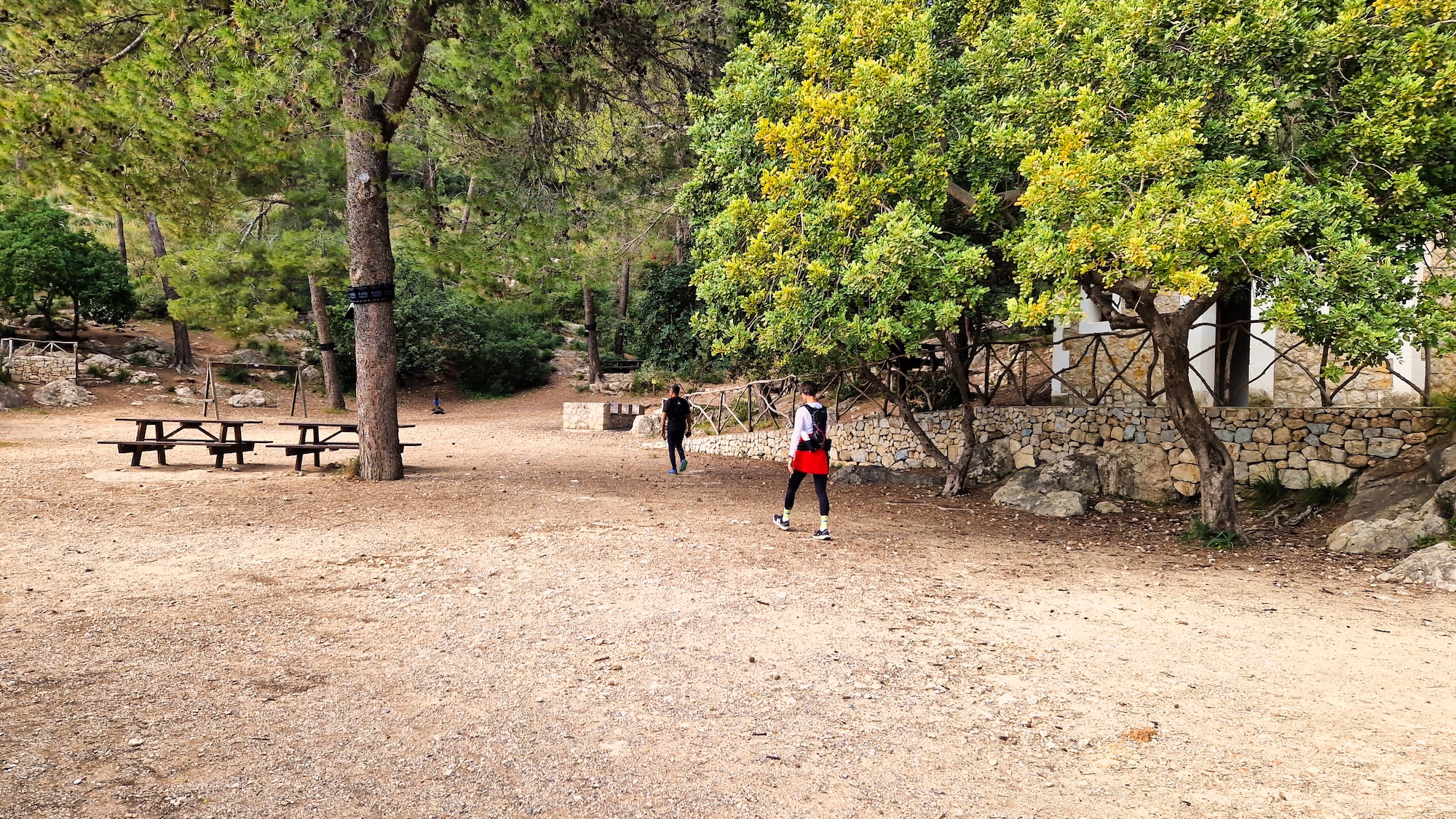 Esta área es una zona de pinar con todos los servicios y cabe destacar que cerca de allí hay un poblado talayótico en mal estado. Enfilamos por un sendero estrecho, fácil de seguir y con bastante pendiente entre algarrobos, acebuches, matas, estepas, pinos y algún horno de cal.