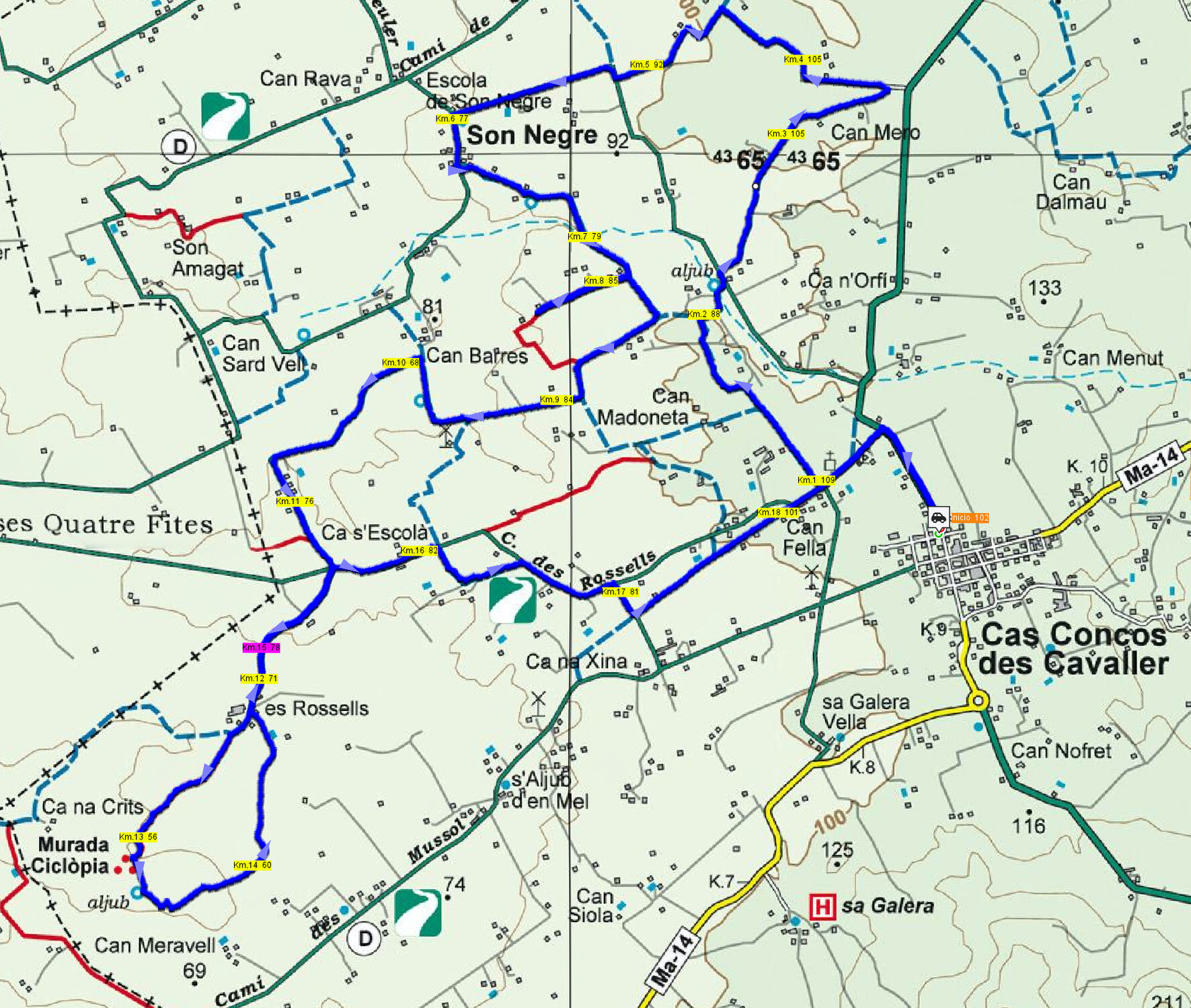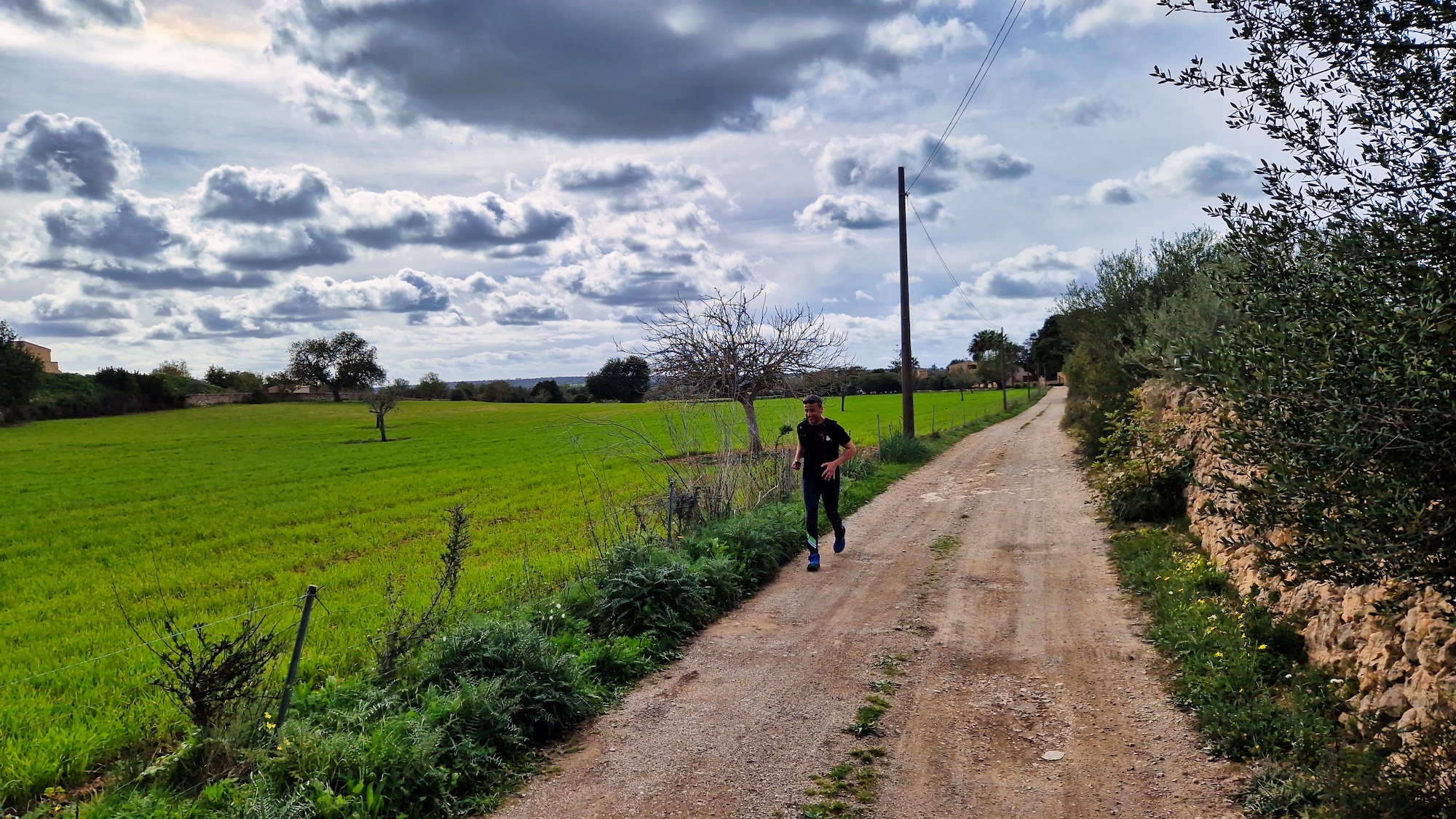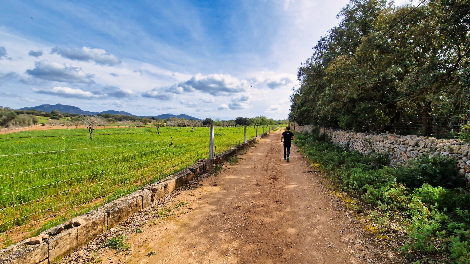 Salimos del núcleo de Ca’n Concos en dirección norte por el Camí des Carreró Llarg, que en pocos metros abandonamos por la izquierda para ir en dirección al cementerio, pasando al lado de tierra santa. Desde el mismo cementerio, giramos hacia la derecha por otro camino asfaltado que en pocos metros se convierte en una pista de tierra excelente para correr.